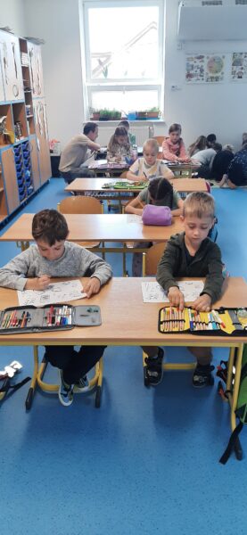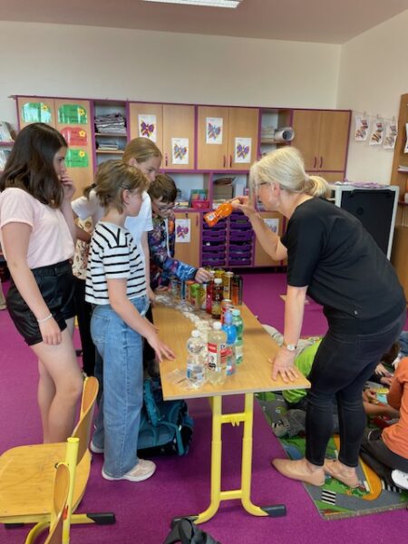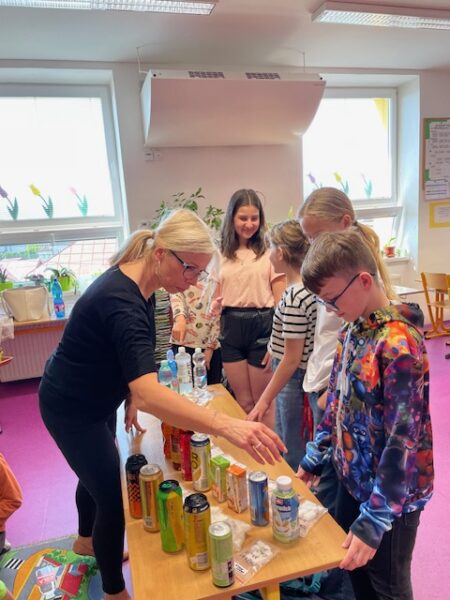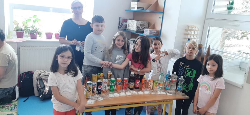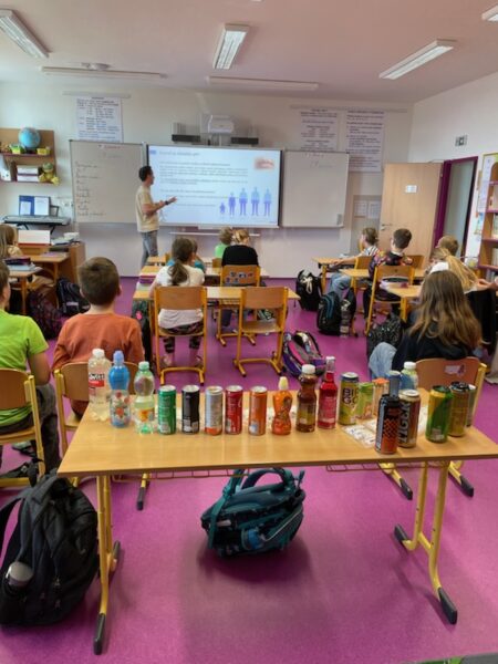 Děti pracovaly s obrázky různých nápojů, vyškrtávaly ty, které nejsou vhodné pro jejich věk, a učily se, kolik kostek cukru obsahují slazené nápoje. Nechyběla ani kreativní část, při které si každý mohl vymyslet a nakreslit vlastní zdravý nápoj – například ovocnou vodu, čaj nebo domácí limonádu bez přidaného cukru.