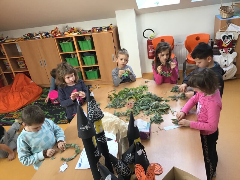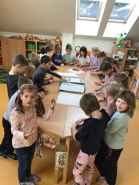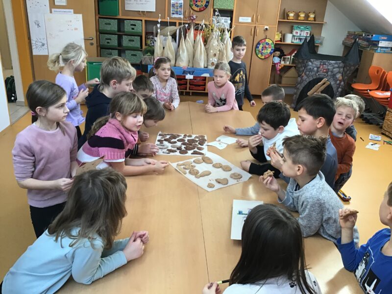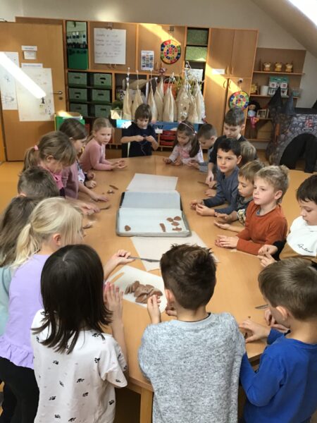 V uplynulém týdnu se školní zahrada proměnila v barevné dílny plné podzimní inspirace. Děti ze školní družiny se s nadšením pustily do sběru listí, které jim posloužilo jako hlavní materiál pro výrobu vlastního adventního věnečku na okno. Nejprve si každý žák vybral listy různých tvarů, barev a vůní – mátové, meduňkové a šalvějové, od zářivě žlutých přes ohnivě červené až po tmavě hnědé. Poté společně ve družině začaly tvořit. Pomocí drátků, provázků a lepidla vznikaly originální věnečky, které nejen ozdobí okna, ale zároveň přinesly do družiny příjemnou podzimní atmosféru. Úkolem bylo co nejlépe využít listí ze zahrady a ukázat, že i přírodní materiály mohou být krásným základem pro vánoční voňavou dekoraci. V dalším týdnu se děti s nadšením pustily do pečení perníčků, které si samy vyválely, vykrajovaly a zdobily. Všude panovala dobrá nálada, smích a vůně koření, které k Vánocům neodmyslitelně patří. Perníčky se vydařily na jedničku – některé měly tradiční tvary, jiné byly výsledkem dětské fantazie. Na závěr si děti na svých výtvorech s radostí pochutnaly spolu s kamarády. Společné pečení bylo krásným zpestřením družinového odpoledne a navodilo všem příjemnou předvánoční náladu.