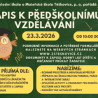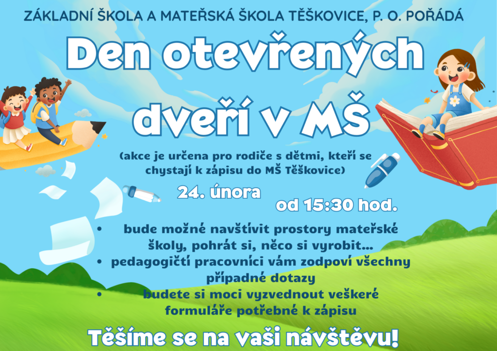 Zveme vás na Den otevřených dveří do MŠ, který se uskuteční 24. 2. 2026 od 15:30 hodin. Těšíme se na vaši návštěvu.
