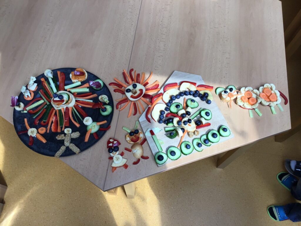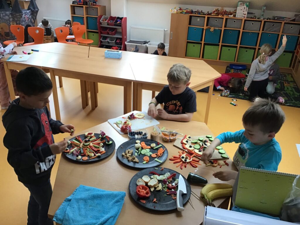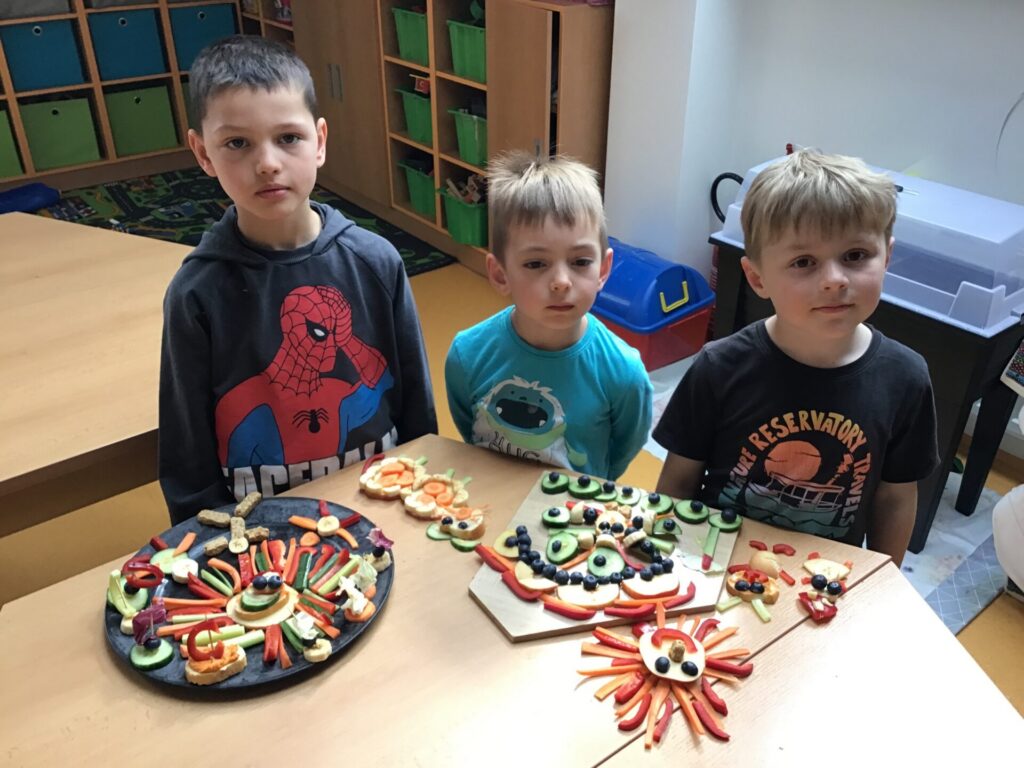 Žáci 1. třídy se s nadšením zapojili do kreativního úkolu s názvem „Zelenino-ovocný obraz“, který byl součástí celostátní soutěže Zdravá 5. Cílem bylo vytvořit jedlé dílo z ovoce a zeleniny, které bude nejen krásné na pohled, ale zároveň poslouží jako zdravá svačina. Děti se pustily do práce s velkou chutí a fantazií. Vznikl nápaditý obraz pod názvem „Kouzelná zahrada“ s bagetkou s cizrnovou pomazánkou, která dodává svačince potřebné bílkoviny. Práce děti velmi bavila. Rozvíjely svou fantazii, jemnou motoriku i vztah ke zdravému stravování. Zároveň si uvědomily, že i obyčejná svačina může být pestrá, hravá a chutná. Zelenino-ovocné obrazy se nakonec proměnily ve veselou výstavu – a po ní samozřejmě i ve zdravou svačinu, která všem chutnala.